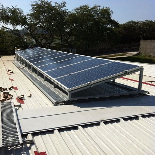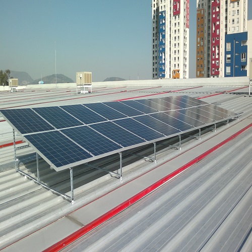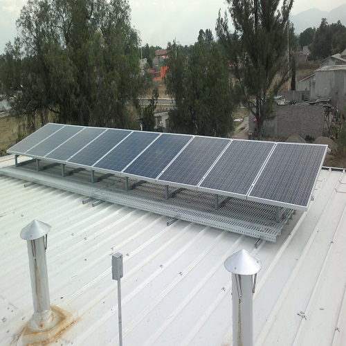 En este caso se diseñó una estructura especial de montaje de los paneles fotovoltaicos para compensar la pendiente de 5% del techo a dos aguas de la tienda y permitir la inclinación y orientación N-S apropiada del arreglo, logrando una plataforma nivelada con un ángulo de acimut de 180°. Casos similares se han presentado en otras tiendas del cliente donde los techos, generalmente a dos aguas, no están orientados exactamente sobre los ejes N-S geográficos.
